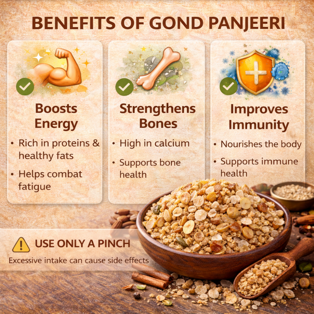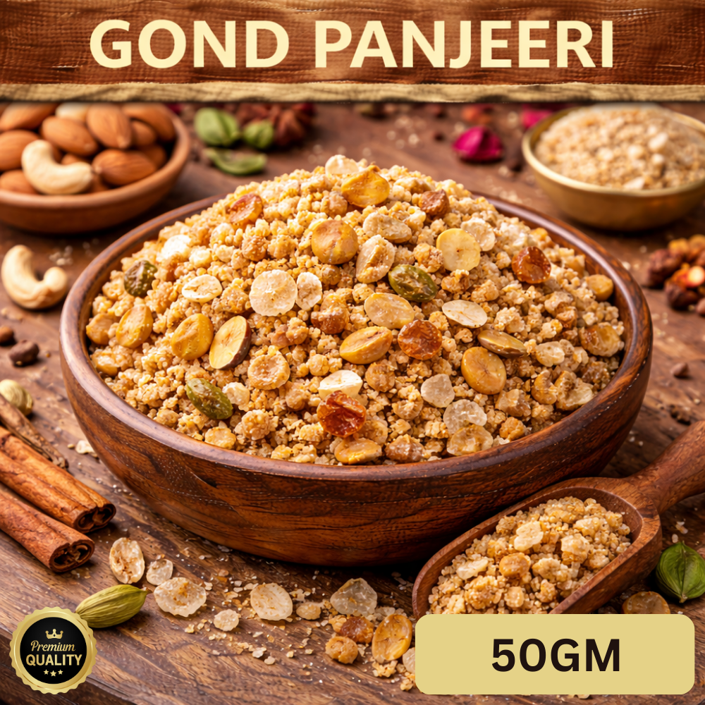 Chuk De Gond Panjeeri is a classic North Indian health food made from edible gum (gond), premium dry fruits, whole wheat flour, and aromatic spices. Carefully prepared to retain its rich flavour and nutritional goodness, it is traditionally consumed for strength, recovery, and overall wellness.