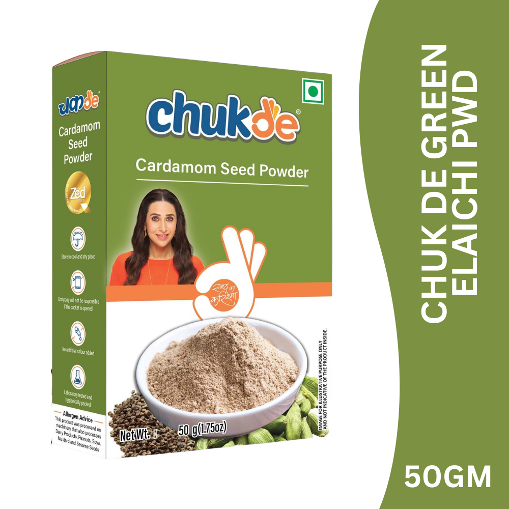 Chuk De Green Elaichi (Cardamom) Powder is made from carefully selected premium green cardamom pods that are hygienically processed and finely ground to preserve their natural fragrance, sweetness, and warm flavour. A prized spice in Indian kitchens, it enhances both sweet and savoury recipes with its luxurious aroma.