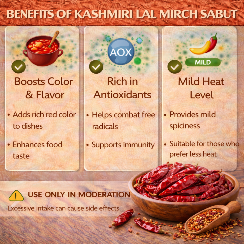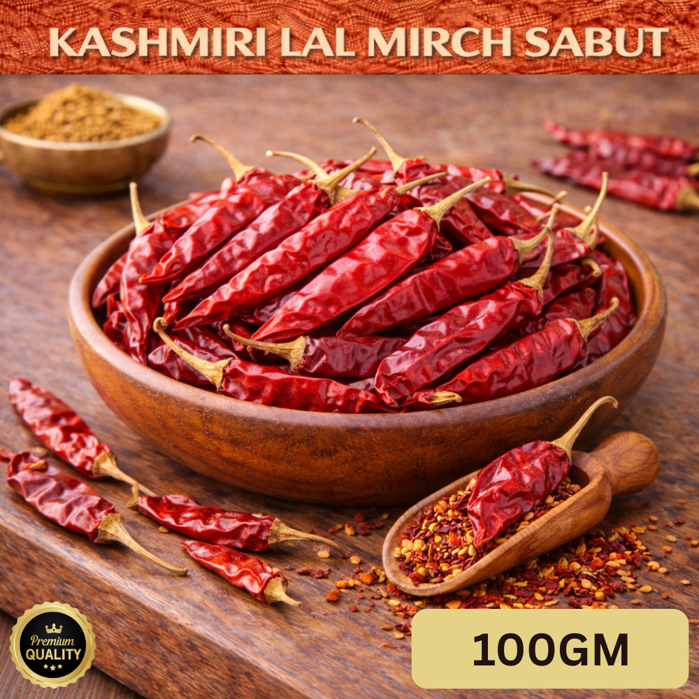 Chuk De Kashmiri Mirch Sabut is made from carefully selected premium whole Kashmiri red chillies, known for their deep red colour and gentle pungency. Hygienically processed and packed, these chillies enhance both the appearance and flavour of dishes without making them overly spicy.