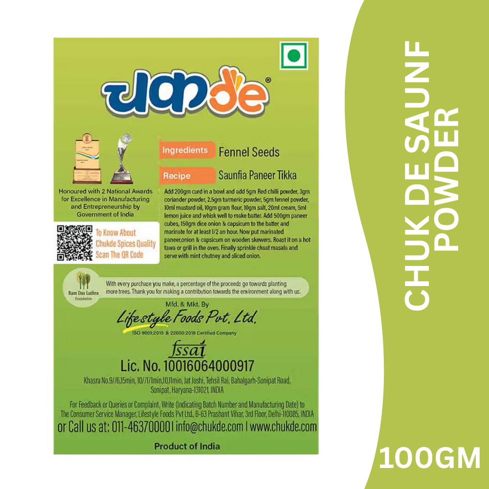 Chuk De Saunf (Fennel) Powder is made from carefully selected fennel seeds that are hygienically cleaned and finely ground to preserve their natural sweetness and cooling aroma. Widely used in Indian cooking and traditional preparations, it enhances both savoury dishes and desserts with its distinctive flavour.