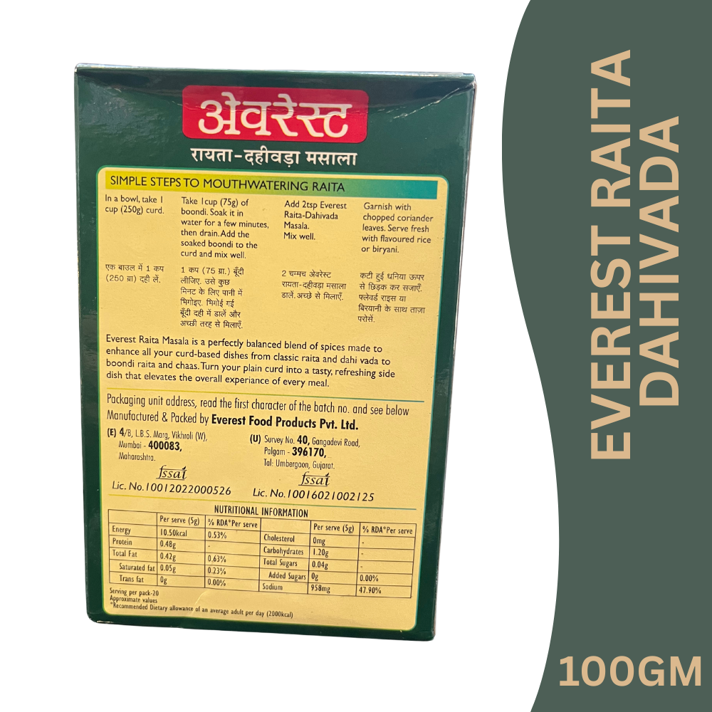 Everest Raita Dahi Vada Masala is a finely balanced blend of aromatic spices specially crafted to enhance the taste of raita, dahi vada, and other curd-based dishes. It adds a refreshing tang, mild spice, and irresistible aroma, making simple curd preparations flavourful and refreshing.