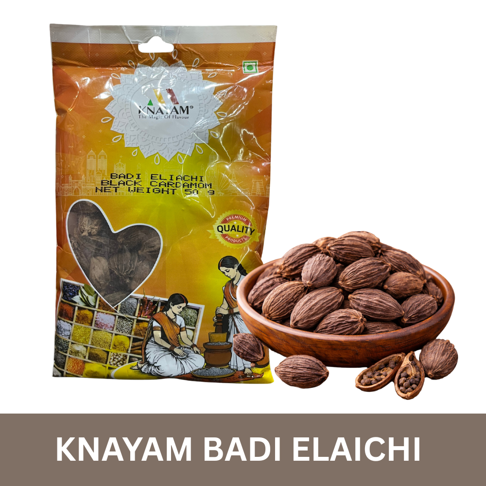 KNAYAM Badi Elaichi, also known as Black Cardamom, is made from carefully selected premium pods that are hygienically cleaned and packed to preserve their strong smoky aroma and robust flavour. A key spice in North Indian and Mughlai cuisine, it enhances biryanis, pulao, curries, and rich gravies with depth and warmth.
