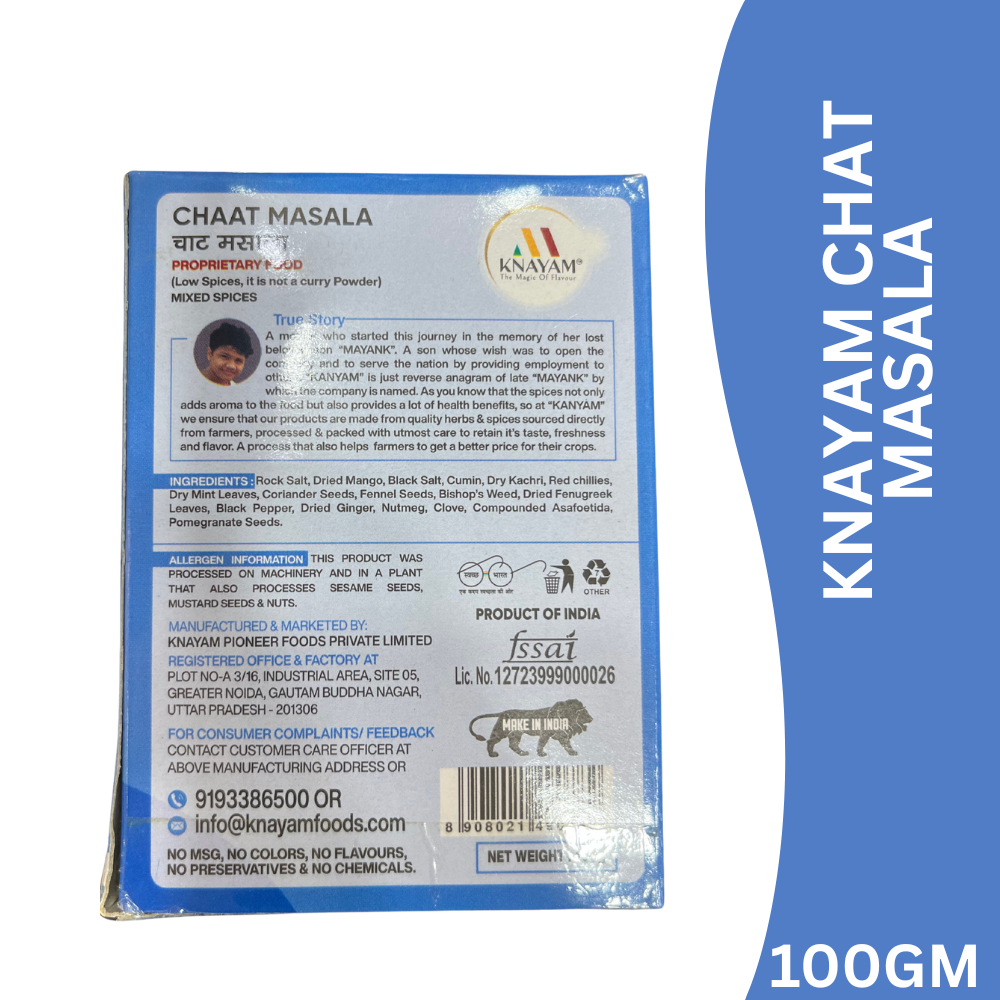 KNAYAM Chat Masala is a zesty blend of carefully selected spices that delivers the perfect balance of tang, spice, and aroma. Just a sprinkle transforms fruits, chaats, salads, and snacks into irresistibly chatpata treats with authentic street-style taste.