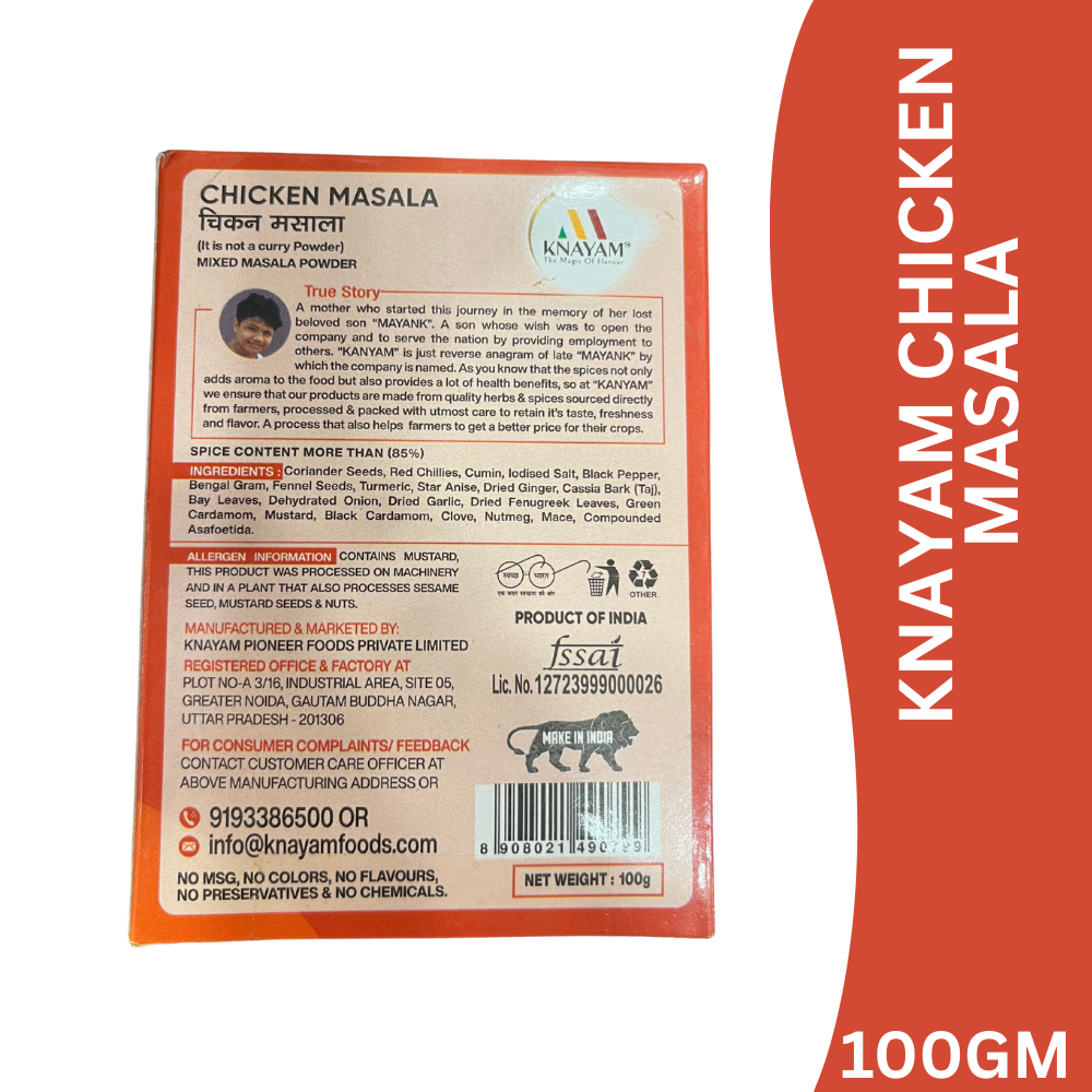 KNAYAM Chicken Masala is a carefully crafted blend of premium spices designed to enhance the taste, aroma, and colour of chicken preparations. Perfectly balanced and aromatic, this masala delivers authentic Indian flavour, making your chicken curries deliciously rich and satisfying.