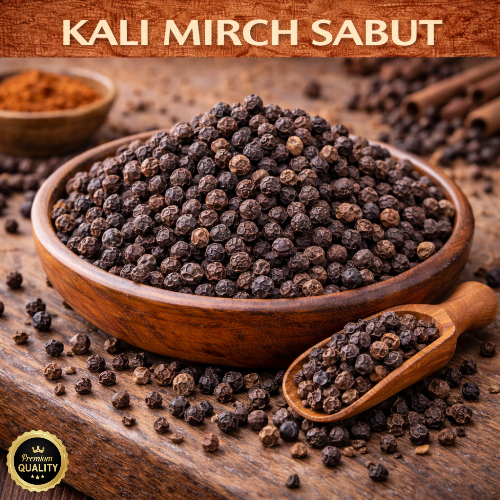 KNAYAM Kali Mirch Sabut is made from carefully selected premium whole black peppercorns that are hygienically cleaned and packed to retain their natural pungency, rich aroma, and essential oils. Known as the “King of Spices,” black pepper enhances flavour, warmth, and depth in both Indian and international cuisines.
