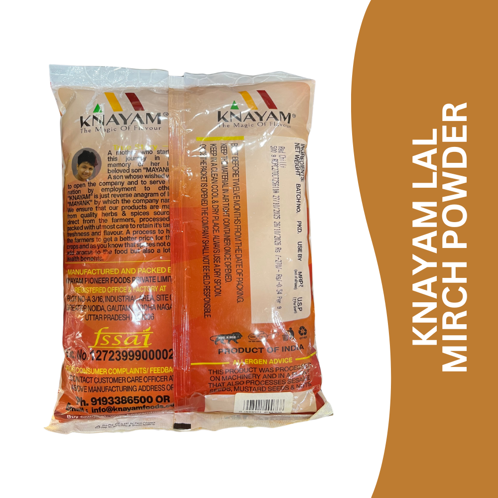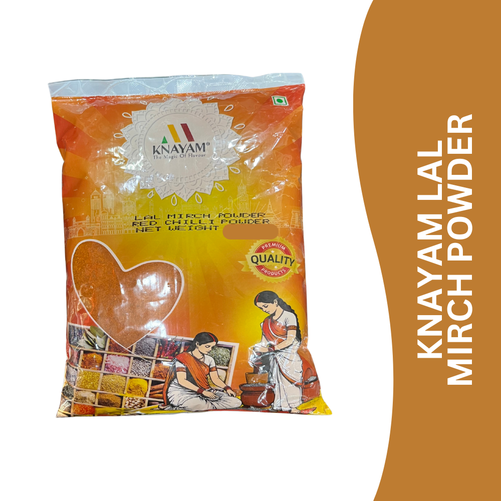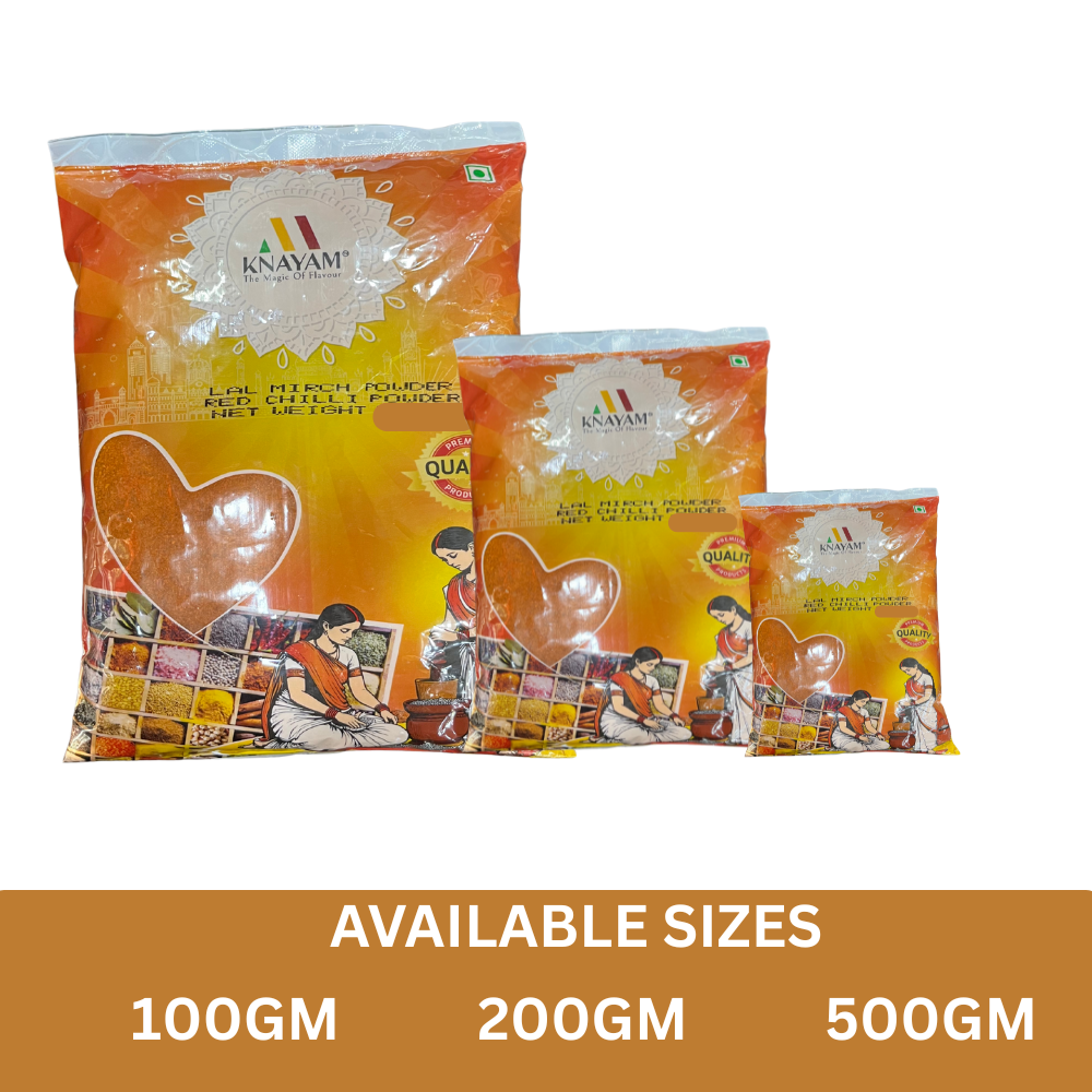 KNAYAM Lal Mirch Powder is made from carefully selected dried red chillies that are hygienically processed and finely ground to retain their natural pungency, colour, and aroma. It adds the perfect spicy kick to Indian dishes while enhancing both taste and appearance.