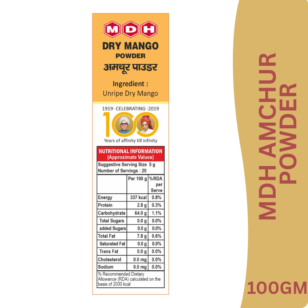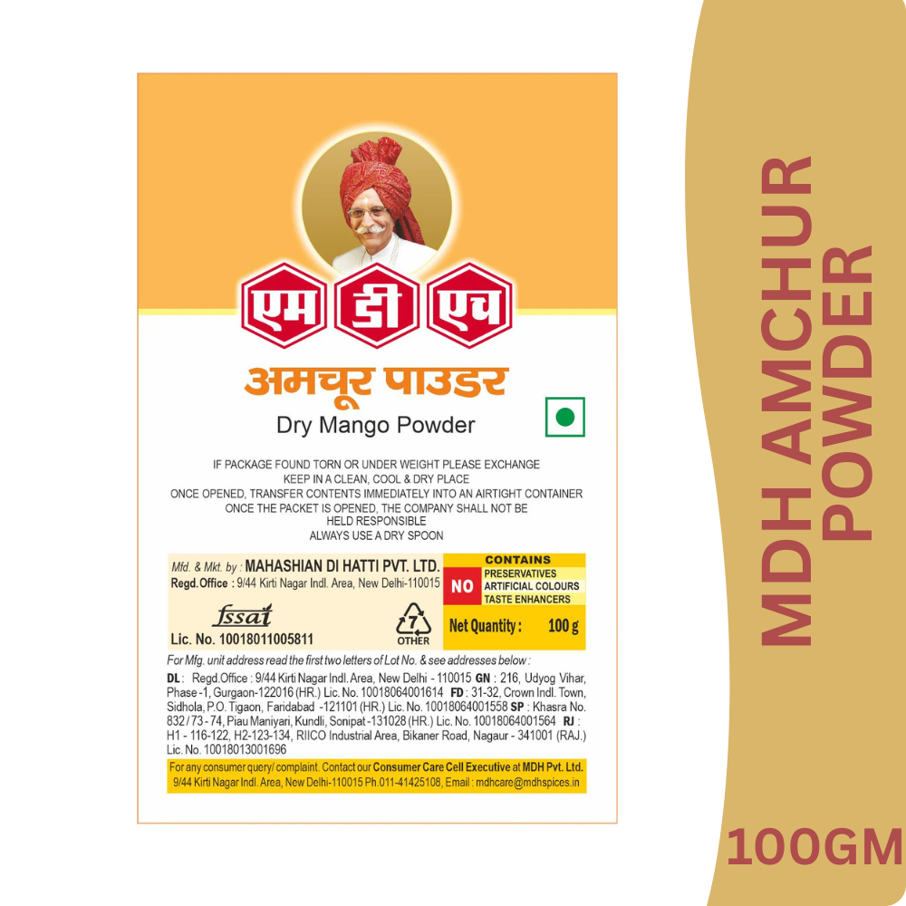 MDH Amchur (Dry Mango) Powder is made from carefully selected raw mangoes that are dried and finely ground to preserve their natural sourness and aroma. A staple in Indian kitchens, this spice adds a refreshing tangy flavour to curries, dals, vegetables, chutneys, and snacks without adding moisture.