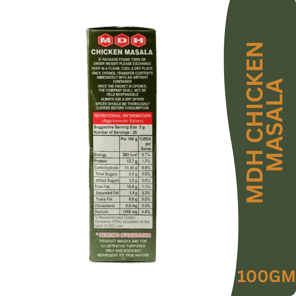 MDH Chicken Masala is a perfectly balanced blend of aromatic spices specially crafted to enhance the taste, colour, and aroma of chicken preparations. Made from carefully selected premium spices, this masala delivers authentic North Indian flavour, making your chicken curries rich, spicy, and irresistibly delicious.