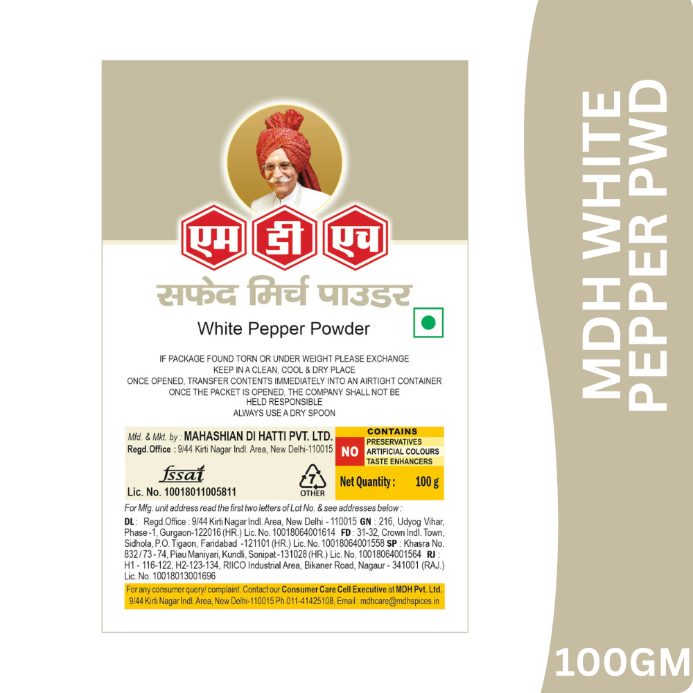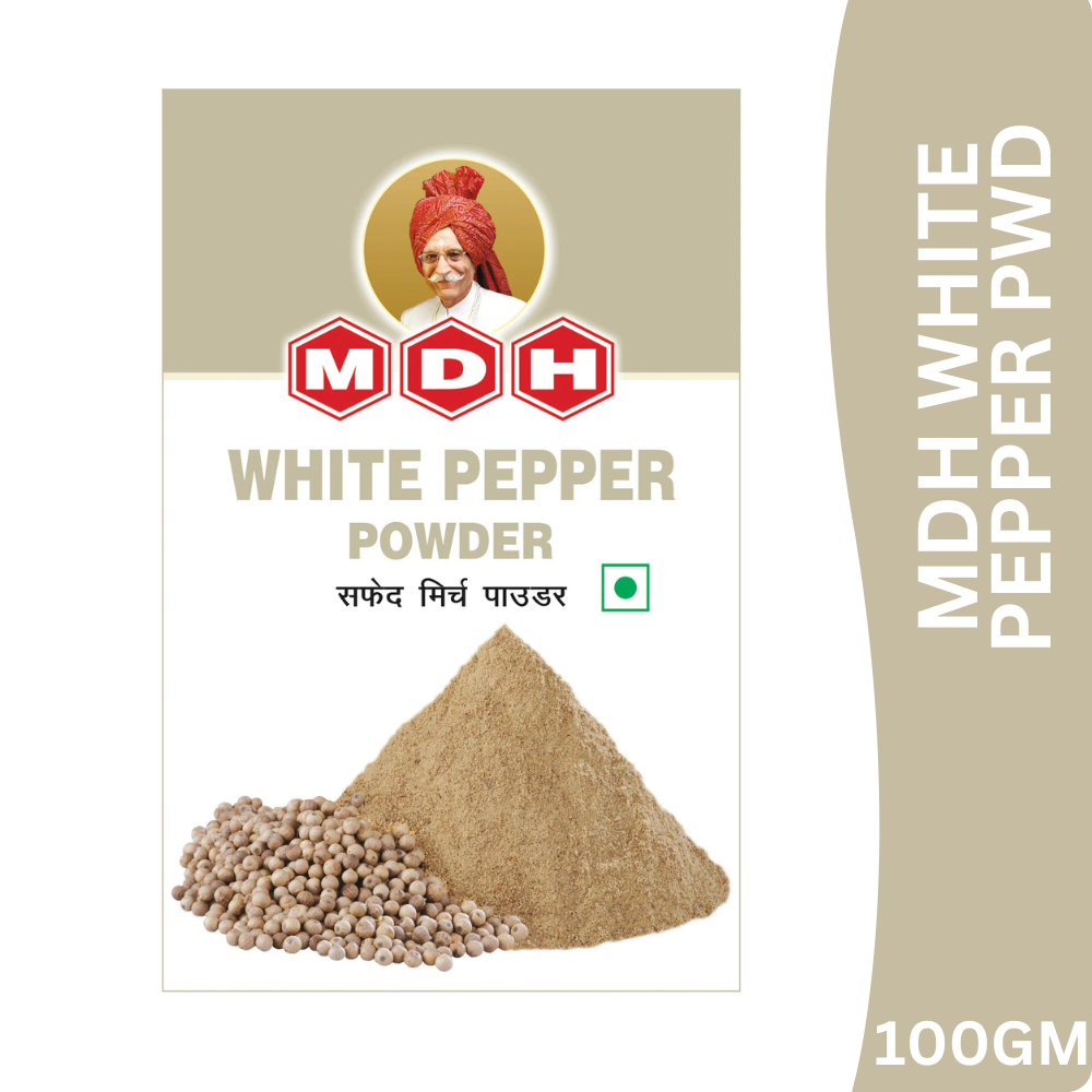 MDH White Pepper Powder is made from carefully selected mature peppercorns with the outer skin removed and finely ground to deliver a smooth, mild pungency and delicate aroma. It enhances flavour without altering colour, making it ideal for light-coloured dishes and international cuisines.