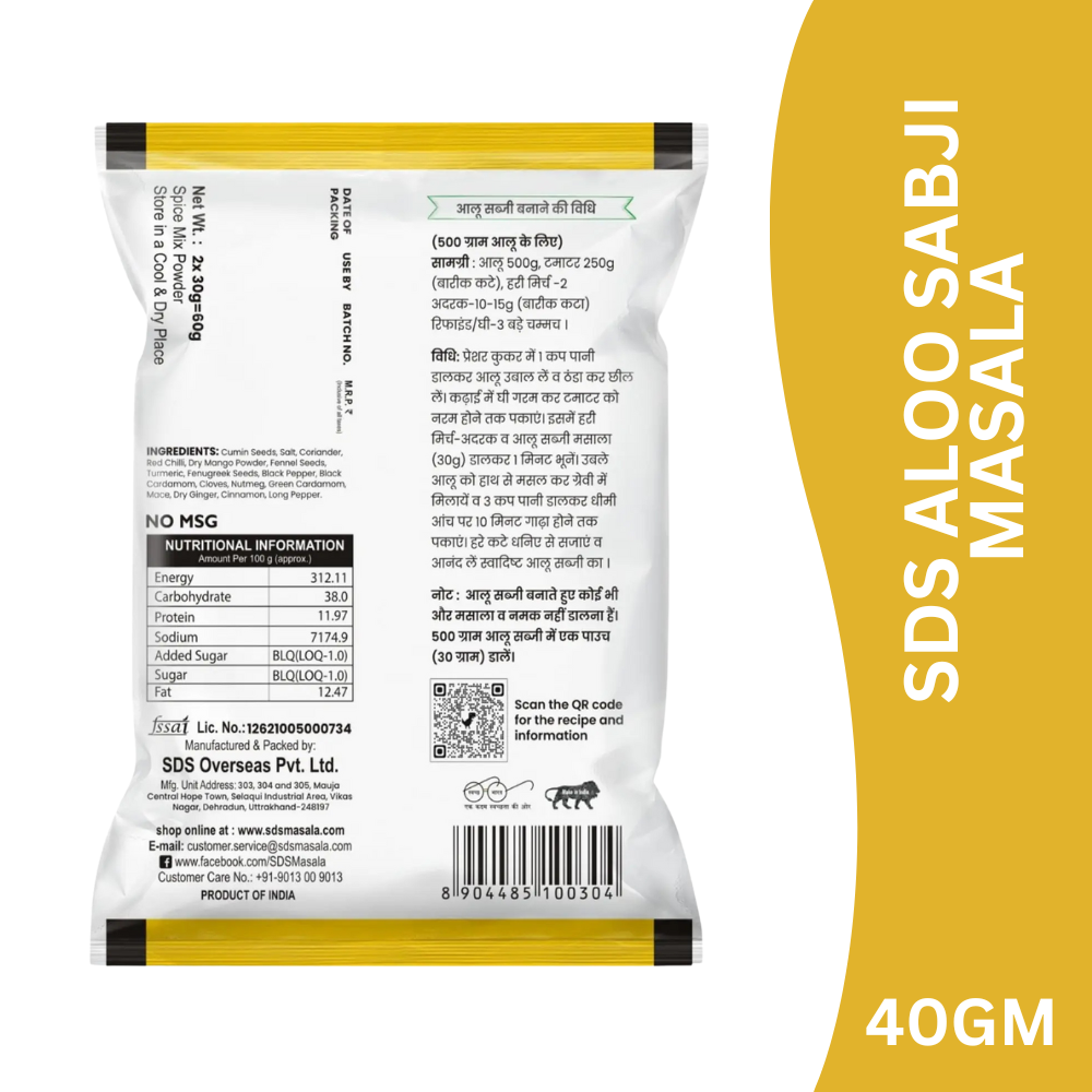 SDS Aloo Sabji Masala is a specially blended mix of aromatic spices crafted to enhance the taste, aroma, and colour of potato-based dishes. With its perfectly balanced spice profile, it delivers delicious, comforting aloo sabji that tastes just like home-cooked food.