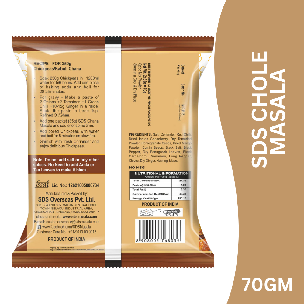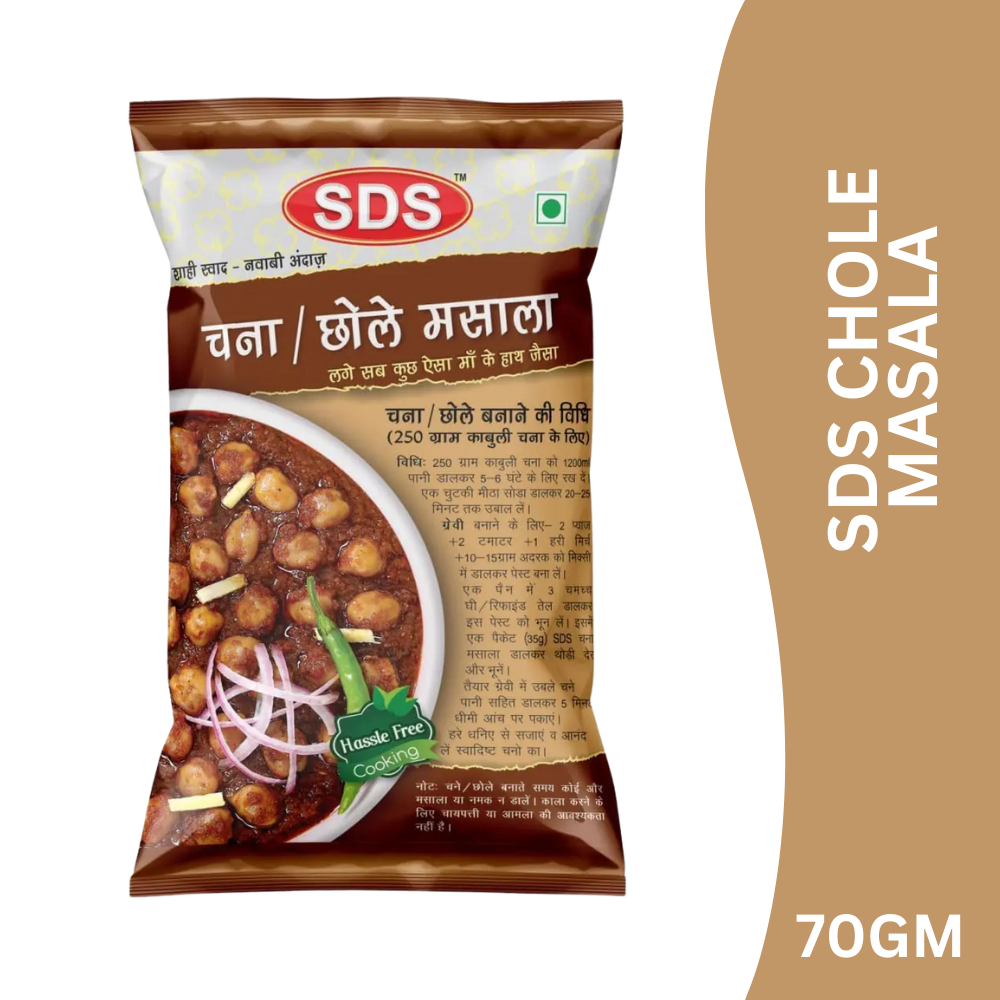 SDS Chole Masala is a specially blended mix of premium spices crafted to enhance the taste, aroma, and colour of traditional chole (chickpea curry). It delivers a bold yet balanced flavour, helping you cook thick, delicious chole just like restaurant and dhaba-style preparations.