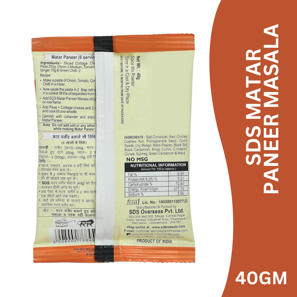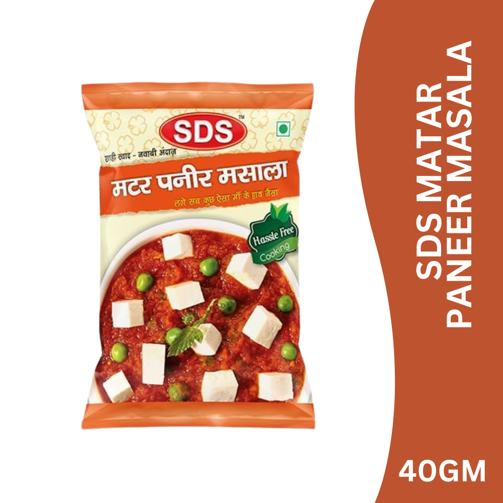 SDS Matar Paneer Masala is a specially crafted blend of premium spices designed to enhance the taste, aroma, and colour of classic matar paneer. With a perfectly balanced spice profile, it delivers a mildly spicy, creamy, and authentic North Indian flavour in every bite.