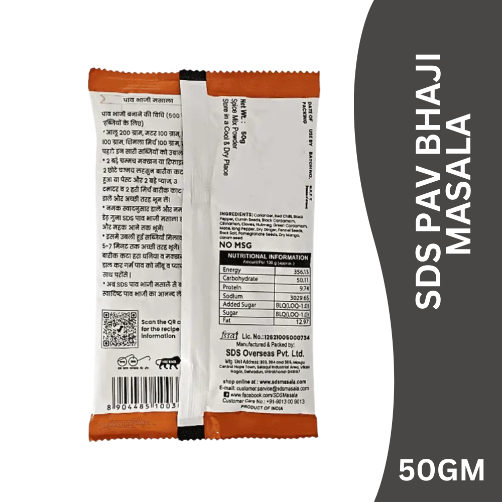 SDS Pav Bhaji Masala is a specially blended mix of premium spices crafted to deliver the signature taste, colour, and aroma of classic pav bhaji. With its perfect balance of spice and tang, this masala makes your bhaji flavourful, smooth, and irresistibly street-style.