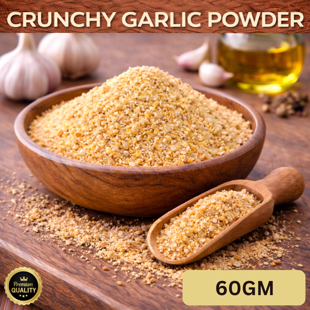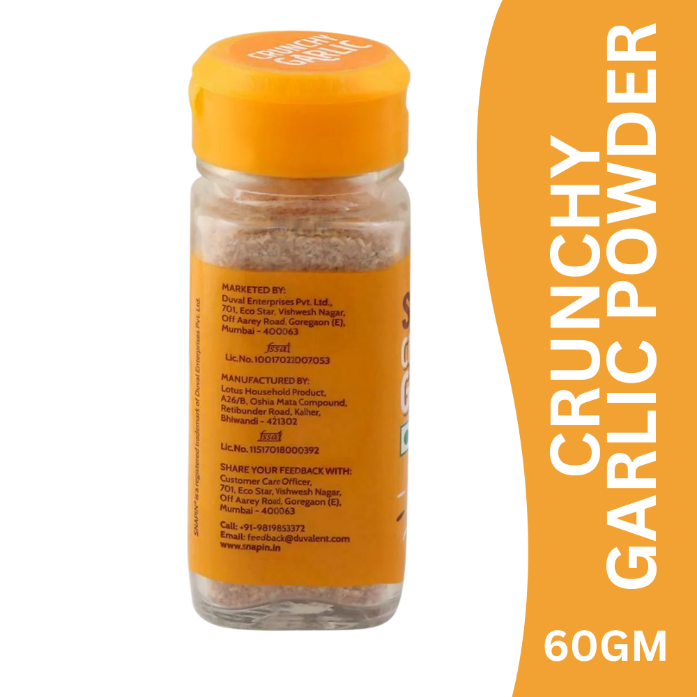 Snapin Crunchy Garlic Powder is made from premium garlic flakes that are carefully dried and processed to retain their natural aroma and strong garlicky flavour, with a crispy, crunchy texture. This seasoning adds both taste and texture, making every bite more exciting and delicious.